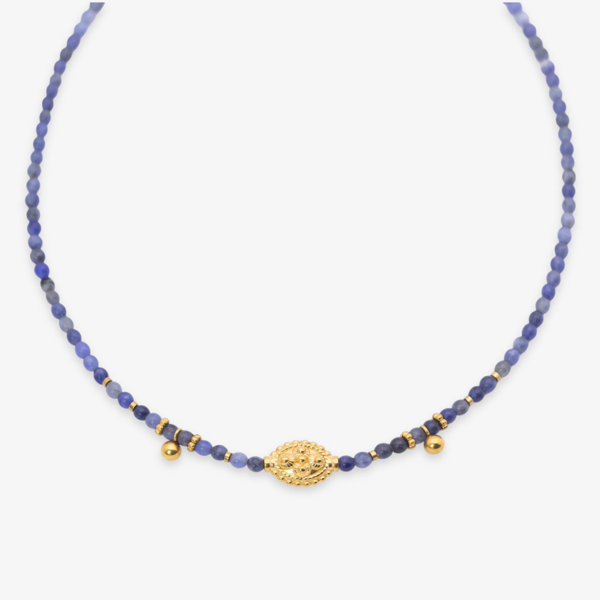 يجمع هذا العقد بين الأحجار الكريمة الزرقاء الغنية مع حبة ذهبية بيضاوية منحوتة من الفولاذ المقاوم للصدأ للحصول على رقي لا ينتهي بمرور الزمن.